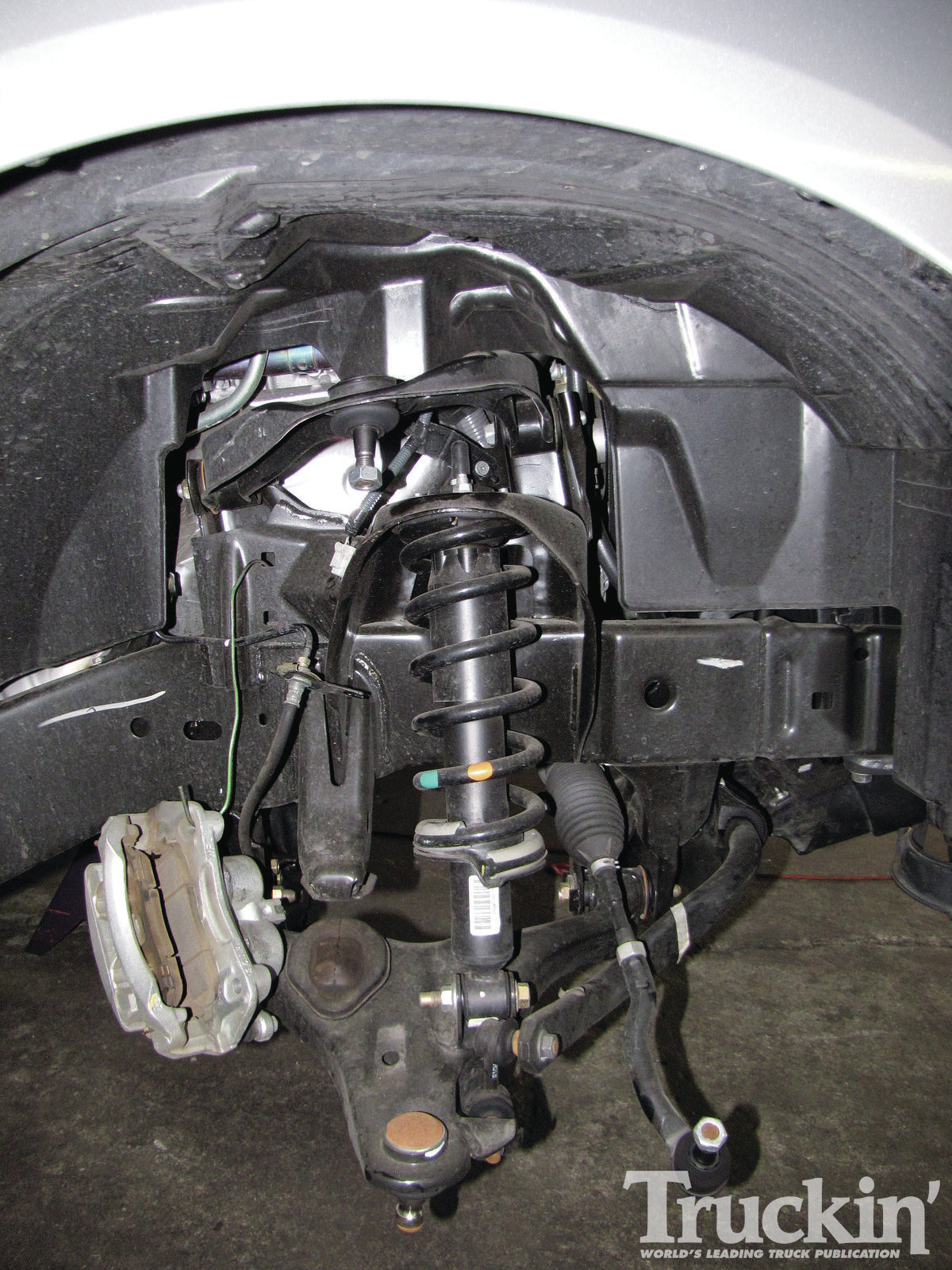 4. This is what will be replacing the factory struts - double adjustable shocks from QA1 and 12-inch-long coil springs with a 600-pound/inch rating. We found the appropriate size shock by determining the GVW, found on the sticker on the driver door.