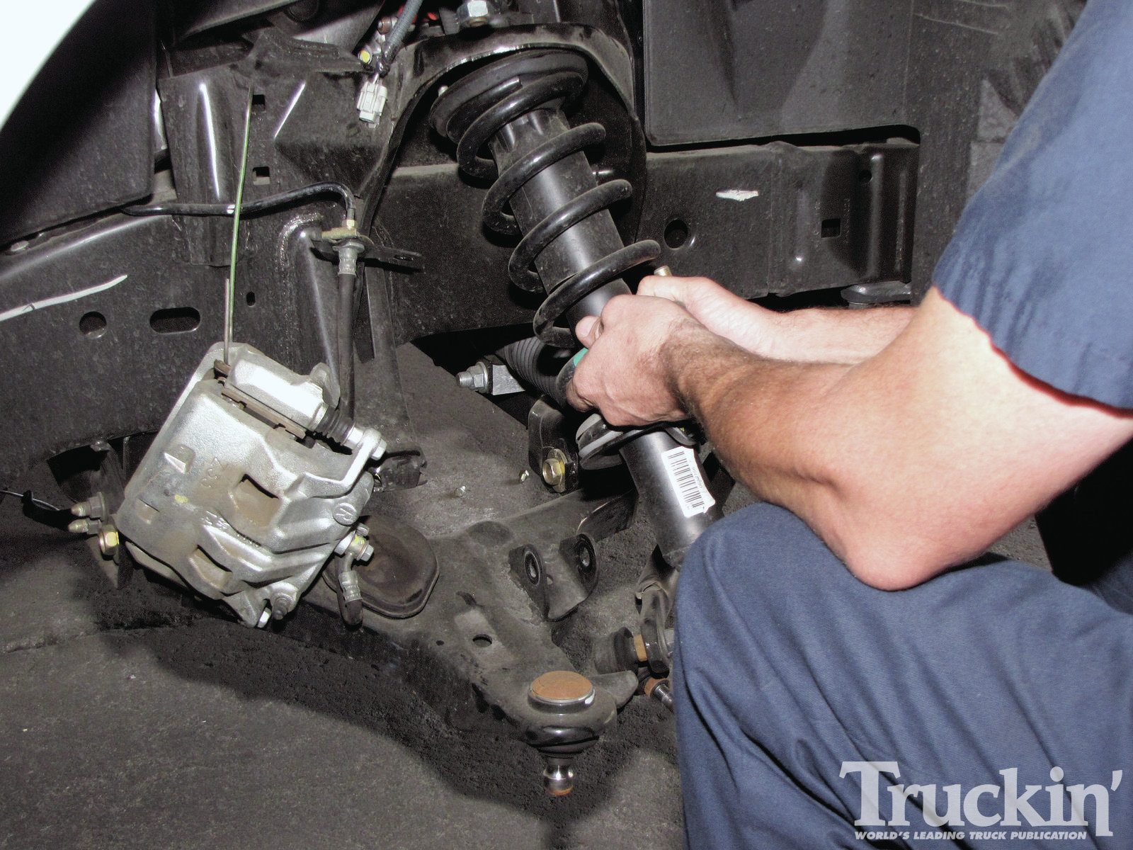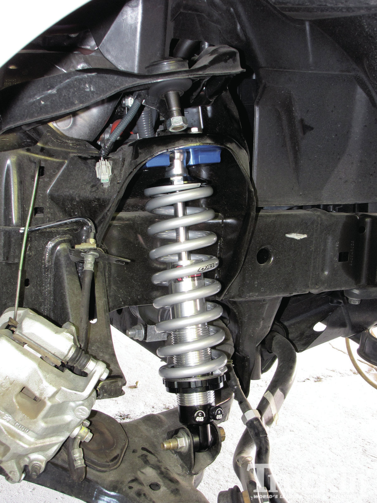 5. After assembling the QA1 coilover setup, Shaughn installed the unit into the factory location. Notice the blue plate between the spring perch and the top of the coilover. That piece is from a Fabtech coilover conversion kit and is part number FT30107. Some drilling was required to get the boltholes to line up just right, but it worked very well.
