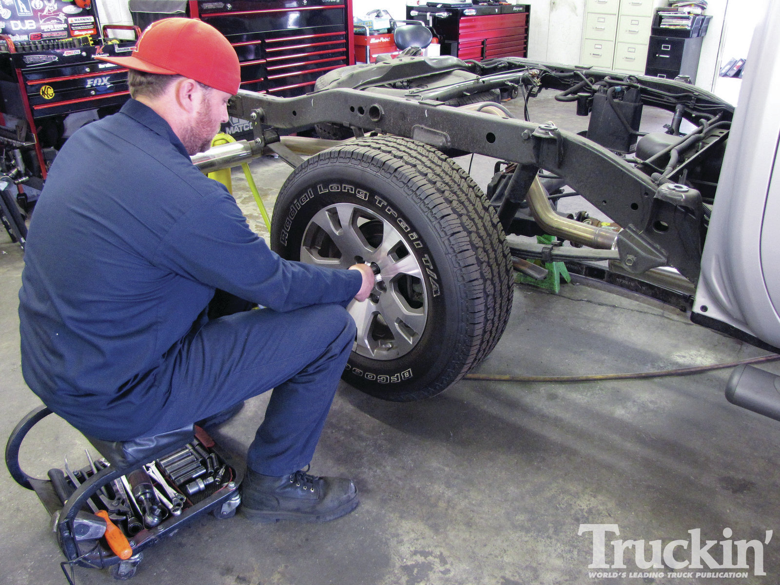 9. Moving to the rear, shop manager Ryan Murphy stepped in and measured the overall wheelbase (to ensure the axle positioning), pulled the Suzuki’s bed off, and then got busy removing the factory wheels and tires.