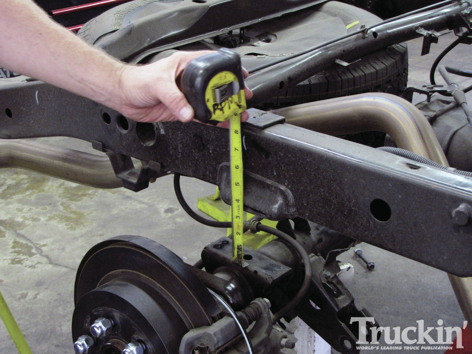 21. John then measured along the frame for the proper crossmember link bar. In our case, the length was 21 inches.